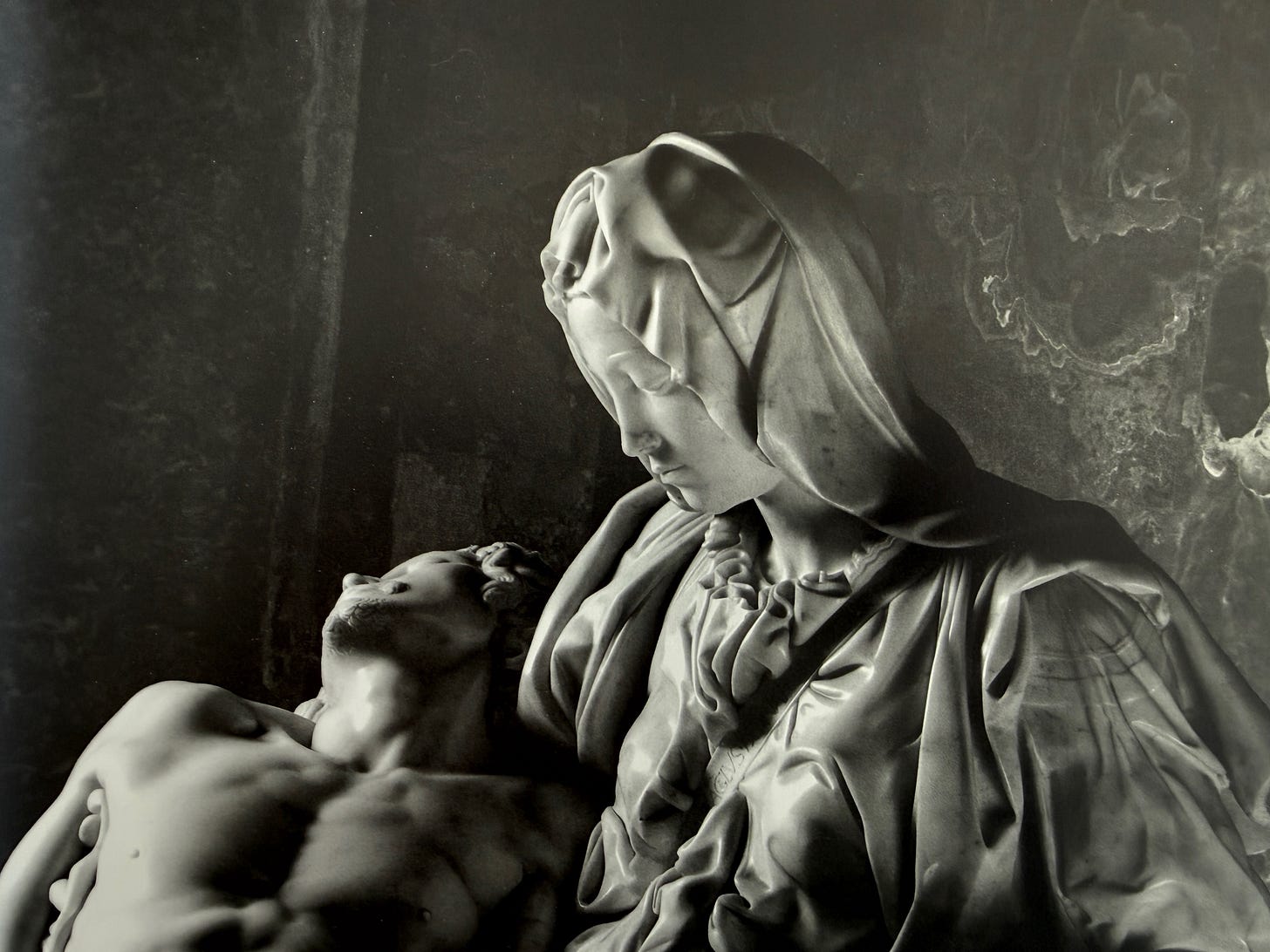 The story of the Crucifixion tells us that Jesus died on the cross, that he was taken down and delivered to Mary, who wept. There are many versions of this story; Michelangelo’s version in marble, finished in 1499, continues to elicit deep and surprising emotions—like those expressed above by a subscriber. Once encountered, especially in person, the Pietà is almost impossible to forget.